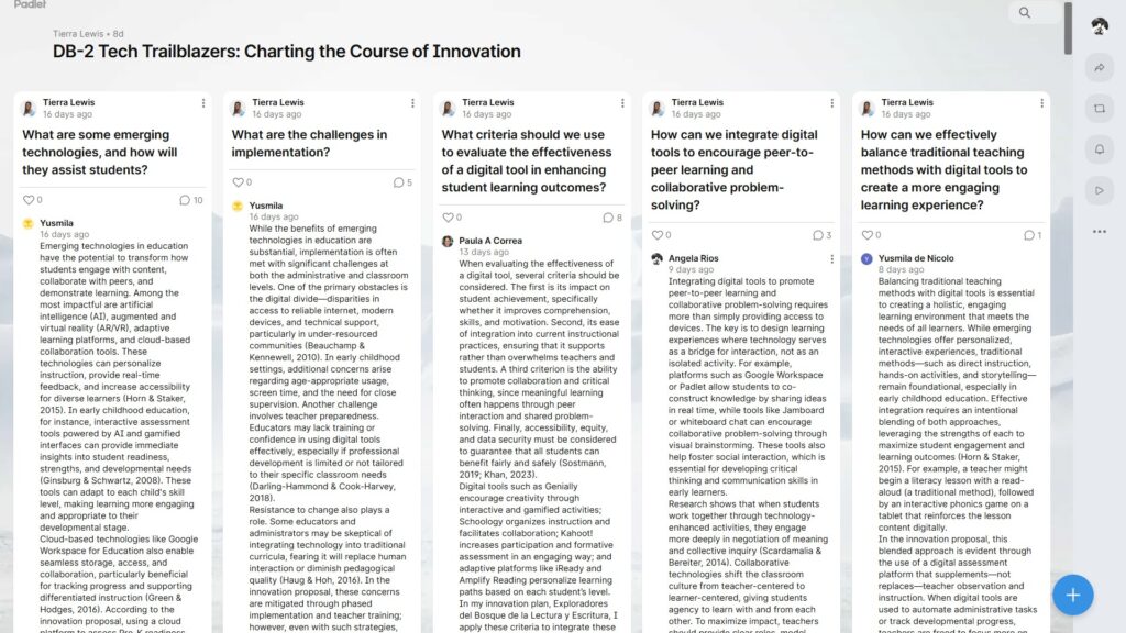 From this exchange, I learned the value of hearing different perspectives and experiences. Each contribution helped me broaden my understanding of how technology can be used with purpose and intention. I connected these ideas with my own innovation plan, Tech Time: My Time in Kindergarten, which aims to promote independence and collaboration among young learners through digital tools. This experience reminded me that while technology is powerful, its use must always be guided by pedagogy, ethics, and a focus on authentic student learning (American Psychological Association, 2020).