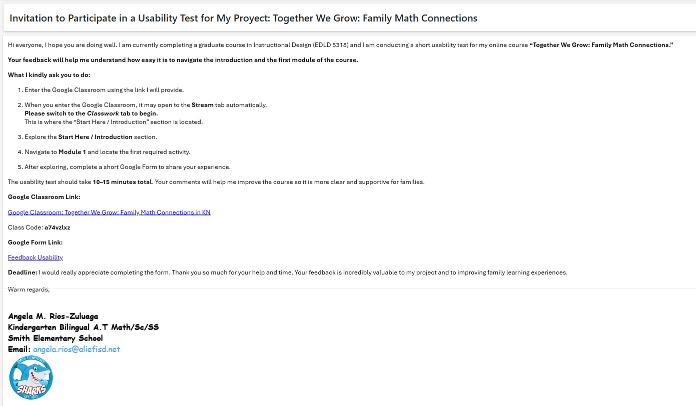 Usability testing is a critical part of the instructional design process because it allows real users to interact with the course before implementation. For my course Together We Grow: Family Math Connections, I invited two colleagues, one administrator, and two kindergarten parents to test the “Start Here / Introduction” section and the first activity of Module 1. Their feedback provided meaningful insight into issues of navigation, clarity, visual design, and overall user experience.